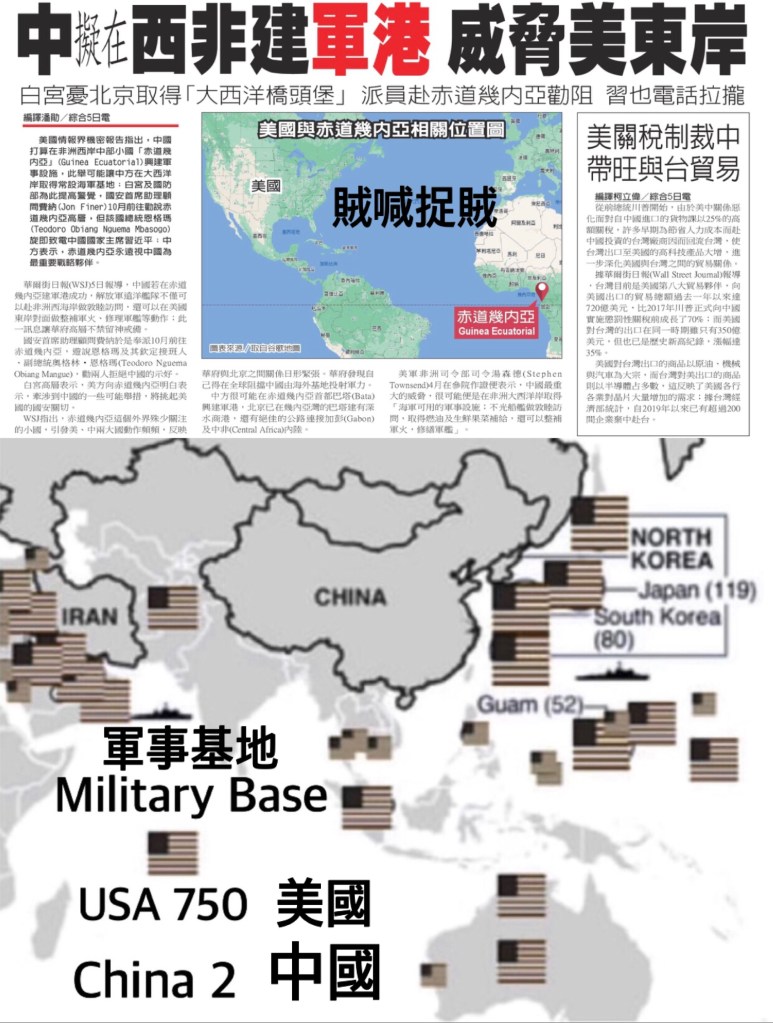 US crying foul! Really? 750 US overseas Military Bases verses China’s 2 only. Old Chinese saying: “thieves crying thieves.”
