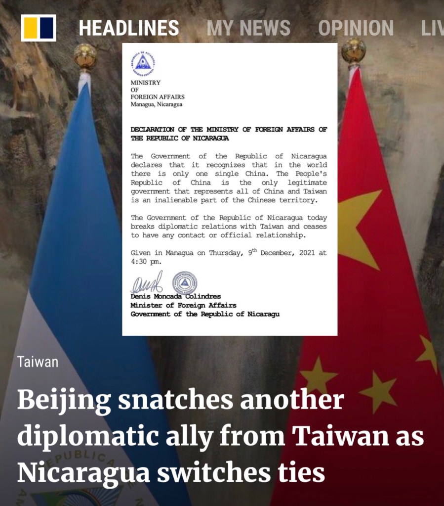 Bye bye Taiwan, Hello Beijing! Taiwan Province loses another ally, with Nicaragua switching ties to Beijing. The Nicaraguan foreign ministry issued a statement saying it recognised there was only a single China. 再見台灣,你好北京! 台灣省失去另一個盟友,尼加拉瓜與北京建交。 尼加拉瓜外交部發表聲明說,它承認只有一個中國. 蔡政府上台5年,斷交8國!算是空前絕後⋯還會再斷的!祖国大陸強国富民每個“五年計劃”都能實事求是的落實,是中國大陸人民政府领導能力的展现!目前第14個五年計劃正在進行中。