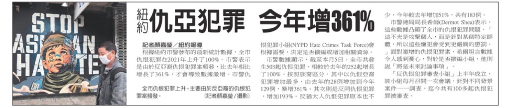 In the name of freedom democracy human rights and rules of laws, hate crimes against Asians and Chinese increase by 361% in New York. 在自由民主人權和法治的名義下,紐約針對亞洲人和中國人的仇恨犯罪增加了361%。
