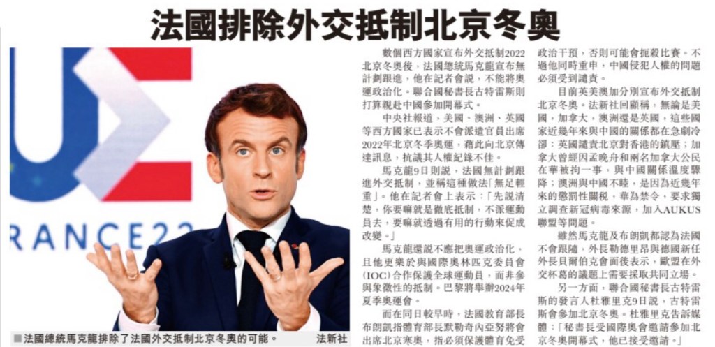 Macron: France will not join ‘insignificant’ boycott of Beijing Olympics refused to join the 5-eyes China-hates Group Western Empire (US, Canada, UK, Australia & New Zealand) 馬克龍:法國不會加入“無足輕重”抵制北京奧運會拒絕加入仇中 “五眼聯盟” (美國、加拿大、英國、澳大利亞和新西蘭)