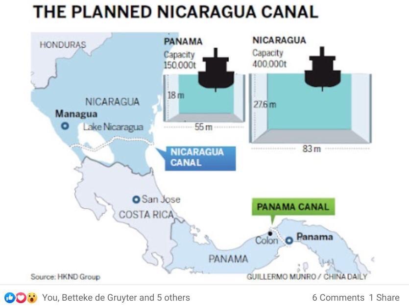 Jim Lochead: ECOLOGY GIVEN PRIORITY CONSIDERATION IN GRAND CANAL PLANNING. Thanks for the big “heads up” from Betteke de Gruyter. .. .. .. “Nicaragua plans a new, bigger, and wider canal connecting two oceans for international shipping. With support from Russia and China {Belt and Road Initiative} the monopolistic grip of the demented US will create a boom to Nicaragua and all of Central America. The criminals in the USA are pulling their hair out and must surely be making plans to disrupt progress in the area, budgeting a fortune into fake insurgencies and media lies.”