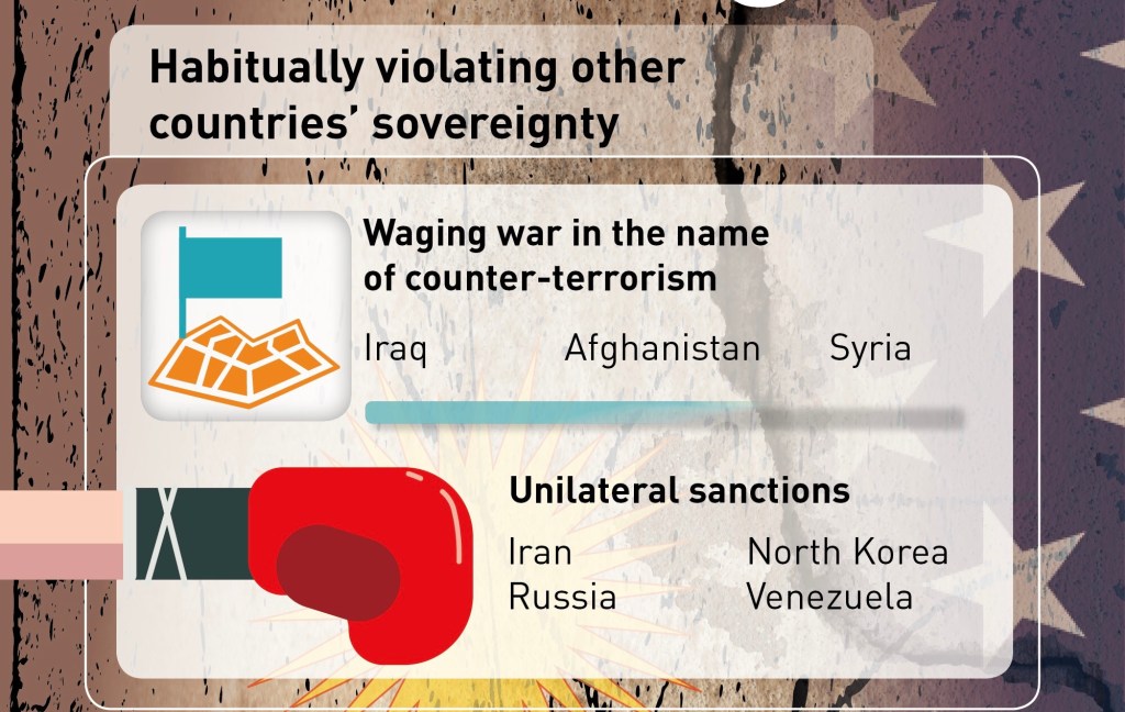 After Donald Trump took office, he generally suspected Islamic countries of being “terrorists.” Meanwhile, under the excuse of “anti-terrorism,” he ramped up air bombings on Iraq, Afghanistan, Syria and other countries, leading to regional turbulence and serious humanitarian disasters. This provided a breeding ground for terrorism. Trump also proposed the “Muslim ban,” arousing opposition and accusations from the international community, the American public and media. They believed the ban seriously violated international human rights standards and the basic rights of Muslims, including freedom of religious belief and personal freedom. In addition to economic sanctions on Iran, the US has long imposed varying degrees of economic pressures on countries such as Russia, North Korea and Venezuela, cutting the link between these countries and the international financial system and interfering in their ideologies. Such unilateral sanctions are a flagrant violation of other countries’ sovereignty.