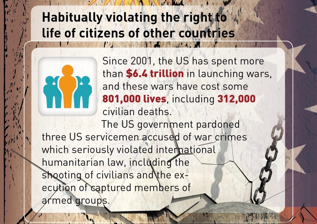 The US government has a tradition of habitually violating the right to life of citizens of other countries. The US’ anti-terrorism military operations often cause large numbers of civilian casualties. A research report released by the Watson Institute of International and Public Affairs at Brown University in 2019 showed that since 2001, the US has spent more than $6.4 trillion in launching wars, and these wars have cost some 801,000 lives, including 312,000 civilian deaths. In a US drone attack in 2018 alone, at least 30 of the casualties were civilians. In addition to the civilian casualties caused by US’ direct military actions, the US government also connives other countries’ killing of civilians in troubled areas. All of these acts show the US’ vicious acts of ignoring the right to life of people from other countries. The civilian casualties caused by the US military in its anti-terrorism military operations are not accidental, but deliberate.