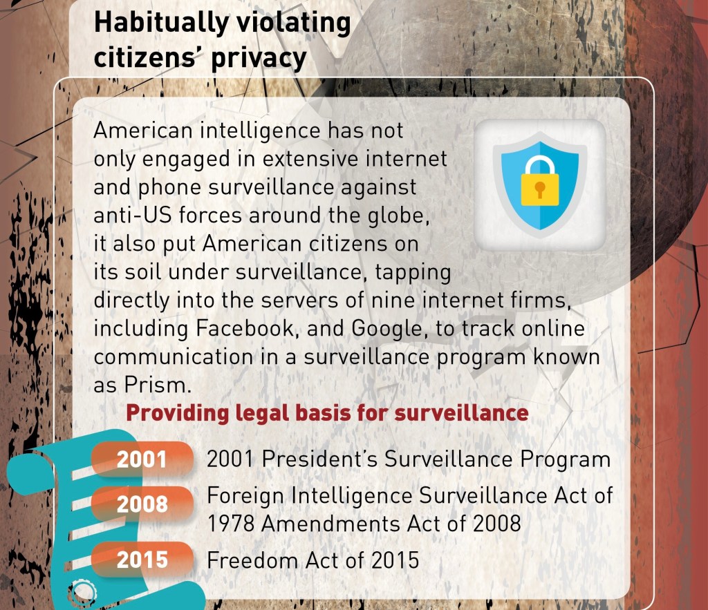 The US has also been habitually violating citizens’ privacy. Various counter-terrorism plans of the US have been infringing upon citizens’ right to privacy. The President’s Surveillance Program launched by the US Department of Homeland Security in October 2001, known by the code name Stellar Wind, was authorized by President George W. Bush as part of the War on Terrorism. It was later transitioned into the Foreign Intelligence Surveillance Act of 1978 Amendments Act of 2008. According to the confidential documents exposed by former CIA contractor Edward Snowden, American intelligence has not only engaged in extensive internet and phone surveillance against anti-US forces around the globe, it also put American citizens on its soil under surveillance, tapping directly into the servers of nine internet firms, including Facebook, and Google, to track online communication in a surveillance program known as Prism.