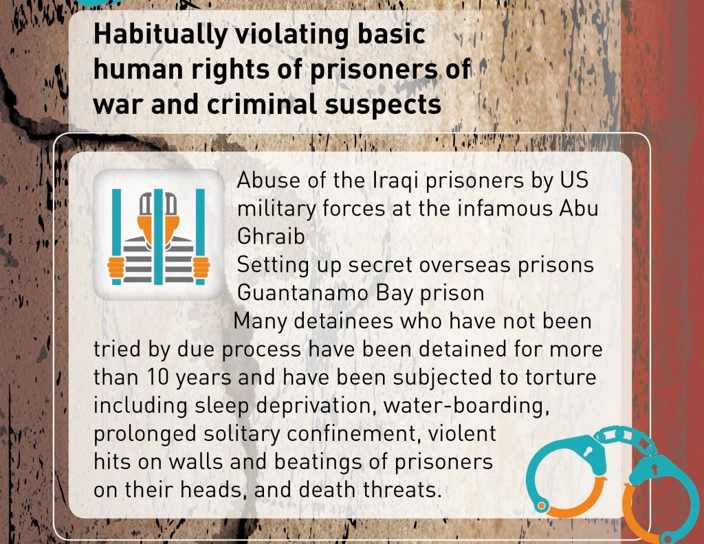 The country has also engaged in habitual violation of the basic human rights of prisoners of war and criminal suspects. In 2004, media outlets’ exposure of the abuse of the Iraqi prisoners by US military forces at the infamous Abu Ghraib, a prison in Iraq, shocked the world. These incidents of prisoner abuse by the US military seriously violated international human rights norms and aroused public outrage across the world. A spokesperson for the International Committee of the Red Cross said in a mocking tone that the US has shown the world what it means to be a democratic and rule-of-law country. These shameful practices not only violate the provisions of the United Nations Convention against Torture and the Universal Declaration of Human Rights, but also run counter to the universal value of human rights, and make the US government’s image as a “defender of human rights” collapse.
