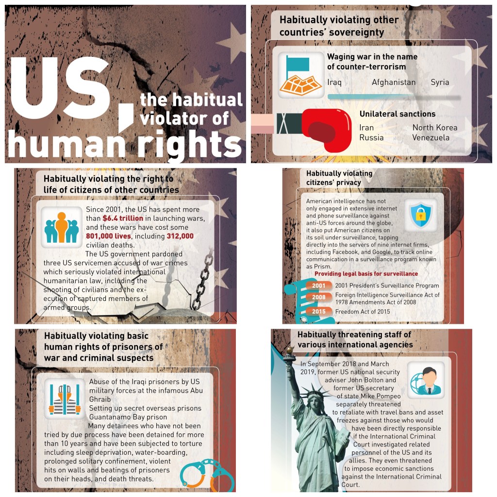 All of the aforementioned examples and data are evidence that US’ habitual violation of human rights has a long history in a wide and deep scope of areas, and has caused huge damages. The only long-standing criterion is whether its target touches the US’ interests. Such moves are supported by US’ hegemonic thinking, which has resulted in the double standards in US diplomacy: It is on one hand infringing upon other countries’ human rights, while on the other hand targeting other countries under the pretense of protecting human rights.