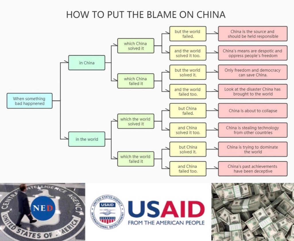 How to talk about China, blame everything on China: NYT/MSM flow chart. 怎麼談中國,把一切都歸咎於中國:紐約時報/數字通訊流程圖.