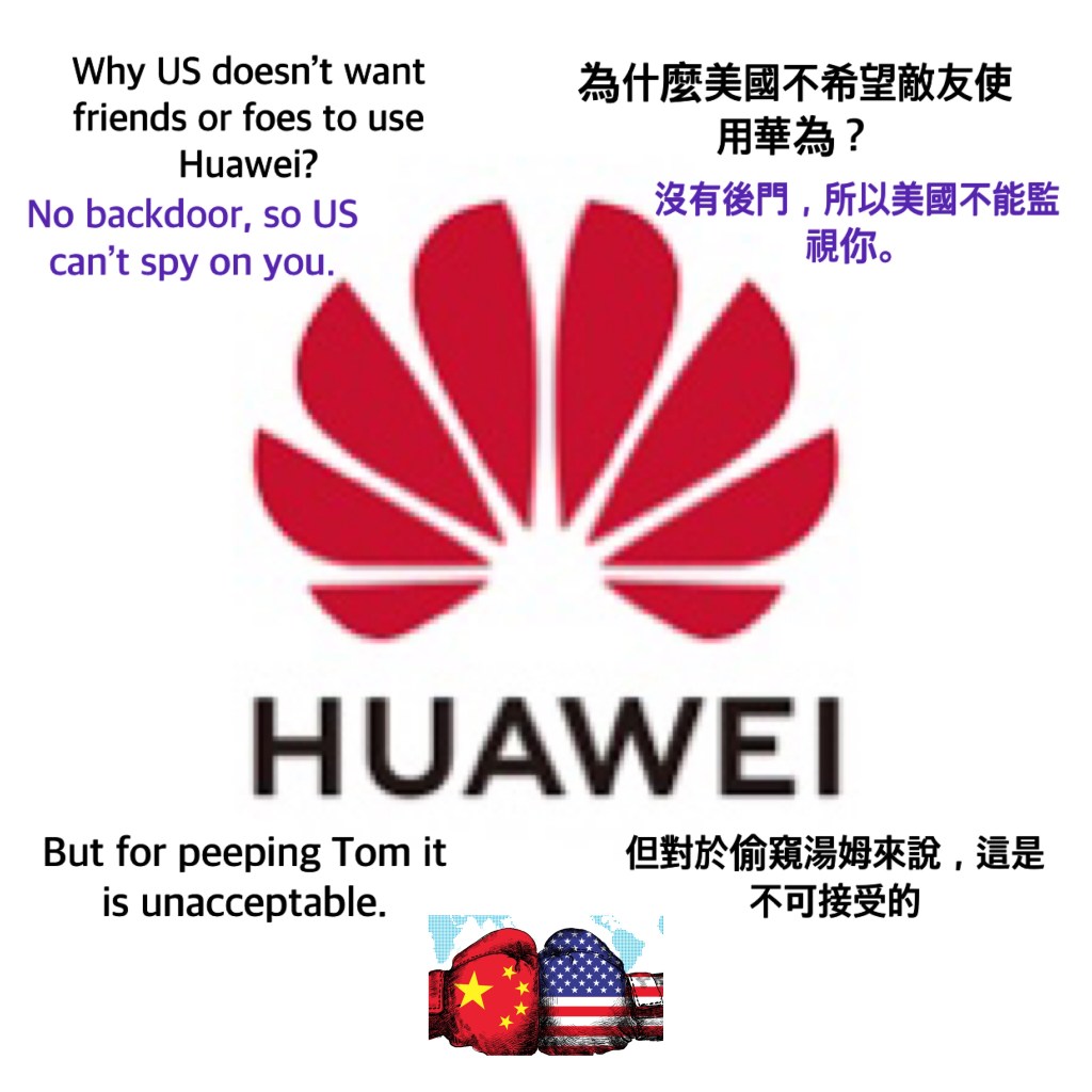 Why US doesn’t want friends or foes to use Huawei? 為什麼美國不希望敵友使用華為?No backdoor, so US can’t spy on you. 沒有後門,所以美國不能監視你。But for peeping Tom it is unacceptable. 但對於偷窺湯姆來說,這是不可接受的.