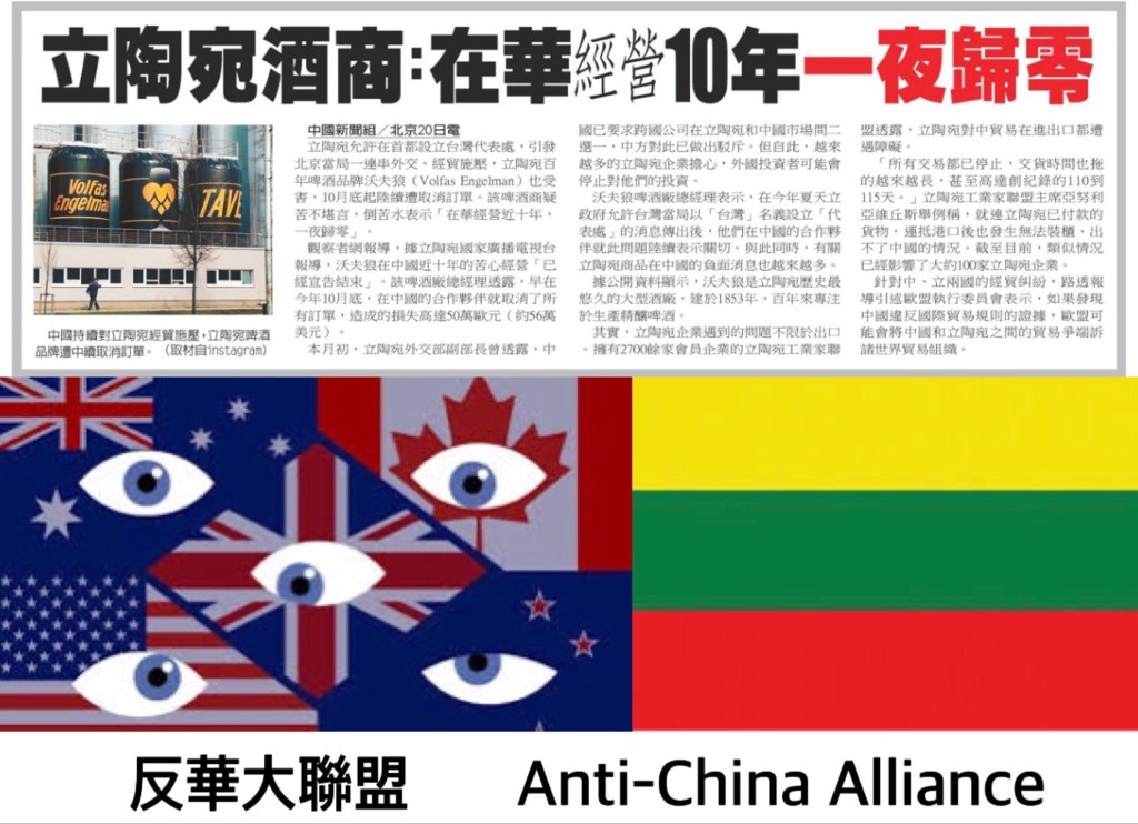 Lithuania became a member of the Anti-China Five Eyes Alliance and abandoned all political and business contacts with China 立陶宛成為反華五眼聯盟成員放棄和中國的一切政商往來.