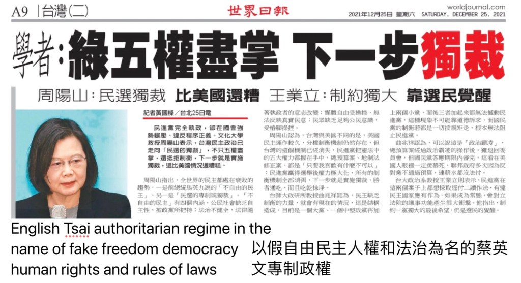 English Tsai authoritarian regime Posted byJohnsonwkchoiDecember 25, 2021Posted inUncategorized English Tsai authoritarian regime in the name of fake freedom democracy human rights and rules of laws 以假自由民主人權和法治為名的蔡英文專制政權 Share this: Share on X (Opens in new window) X Share on Facebook (Opens in new window) Facebook Like Loading...