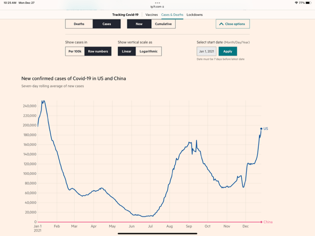 Professor John V Walsh, MD, in San Francisco: This is what happens when the fundamental value of a society is to put human life first (China) and not the economy (USA). (From the very conservative Financial Times) 當一個社會的基本價值是將人的生命放在首位 (中國) 而不是經濟 (美國)時,就會發生這種情況