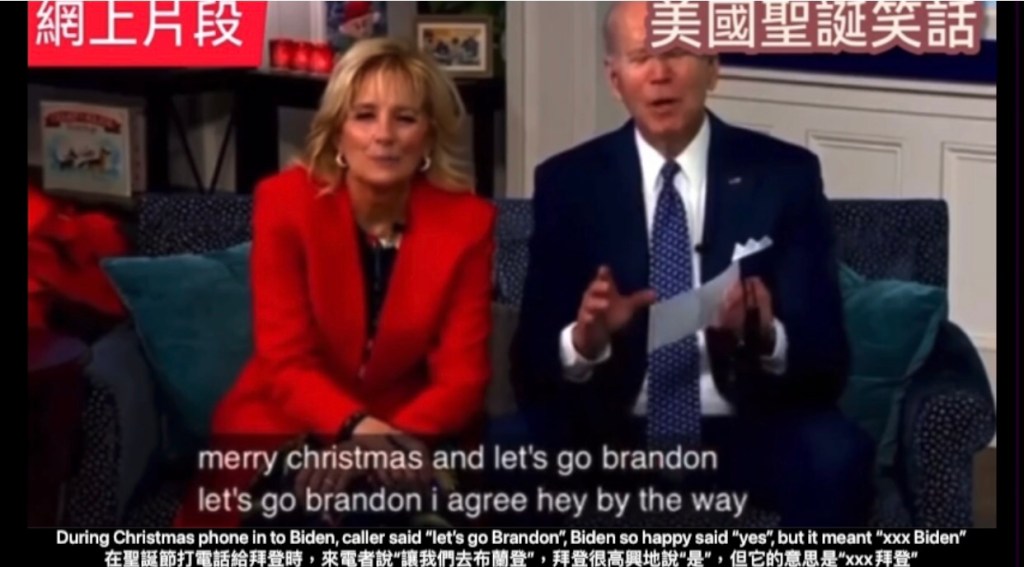 Video: During Christmas phone in to Biden, caller said “let’s go Brandon”, Biden so happy said “yes”, but it meant “xxx Biden” 在聖誕節打電話給拜登時,來電者說“讓我們去布蘭登”,拜登很高興地說“是”,但它的意思是“xxx拜登”