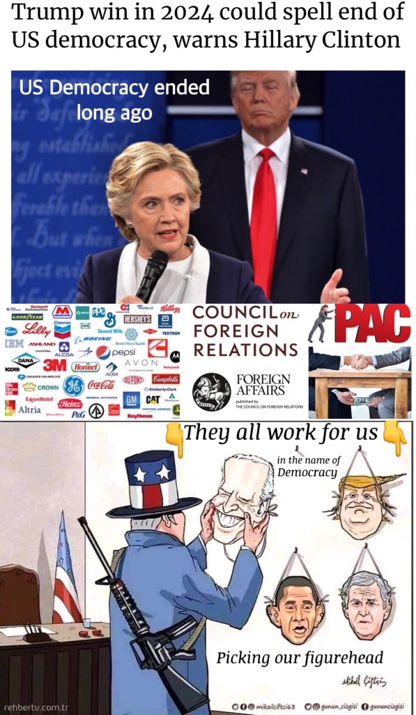 Hillary’s warning is hollow. US democracy has ended long ago now controlled by less than 1% elites, Fortune 500 companies and military industrial complex. 希拉里的警告是空洞的。 美國民主早已名存實亡, 美國現在由不到 1% 的精英、財富 500 強公司和軍事工業綜合體控制.