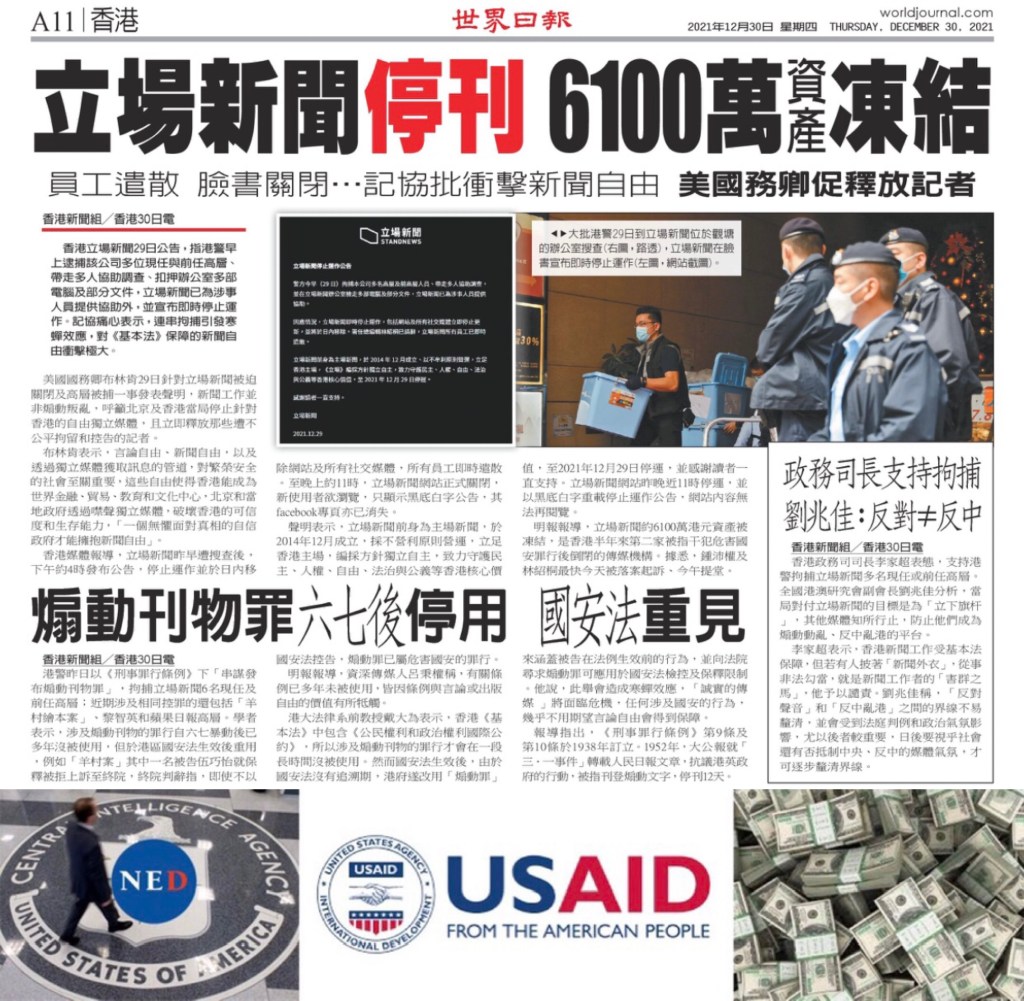 The HK government’s December 29 raid and arrest of seven senior staff supported by NED at Stand News have forced another free and independent media in HK to cease operations. 香港政府 12 月 29 日突襲並逮捕了美國民主基金會支持的 7 名高級職員,這迫使香港另一家自由獨立的媒體停止運營。