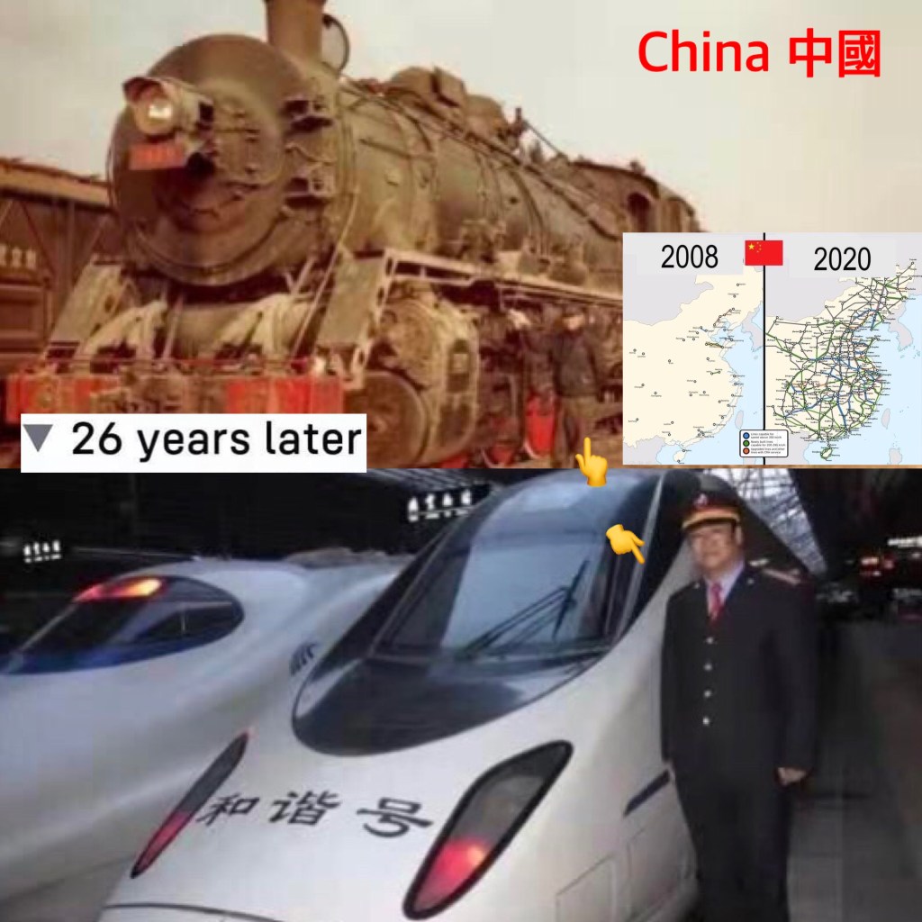 Two pics, same person: China Train driver Han Junjia’s snapshots with his trains capture the transformation of Chinese trains in just 26 years. 兩張圖,同一個人:中國火車司機韓俊佳與火車的合影,記錄了中國火車在短短26年裡的蛻變.