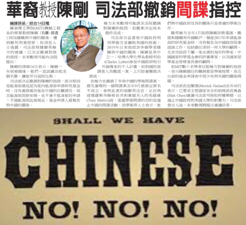 U.S. prosecutors recommend dropping case against MIT professor over China ties 美國檢察官建議撤銷對麻省理工學院教授與中國關係的訴訟. 加州大學伯克利分校王靈智教授:令人驚訝的是,每個與陳鋼案有關的政府官員突然無話可說。 我很高興麻省理工學院的管理人員和教職員工為陳教授辯護.