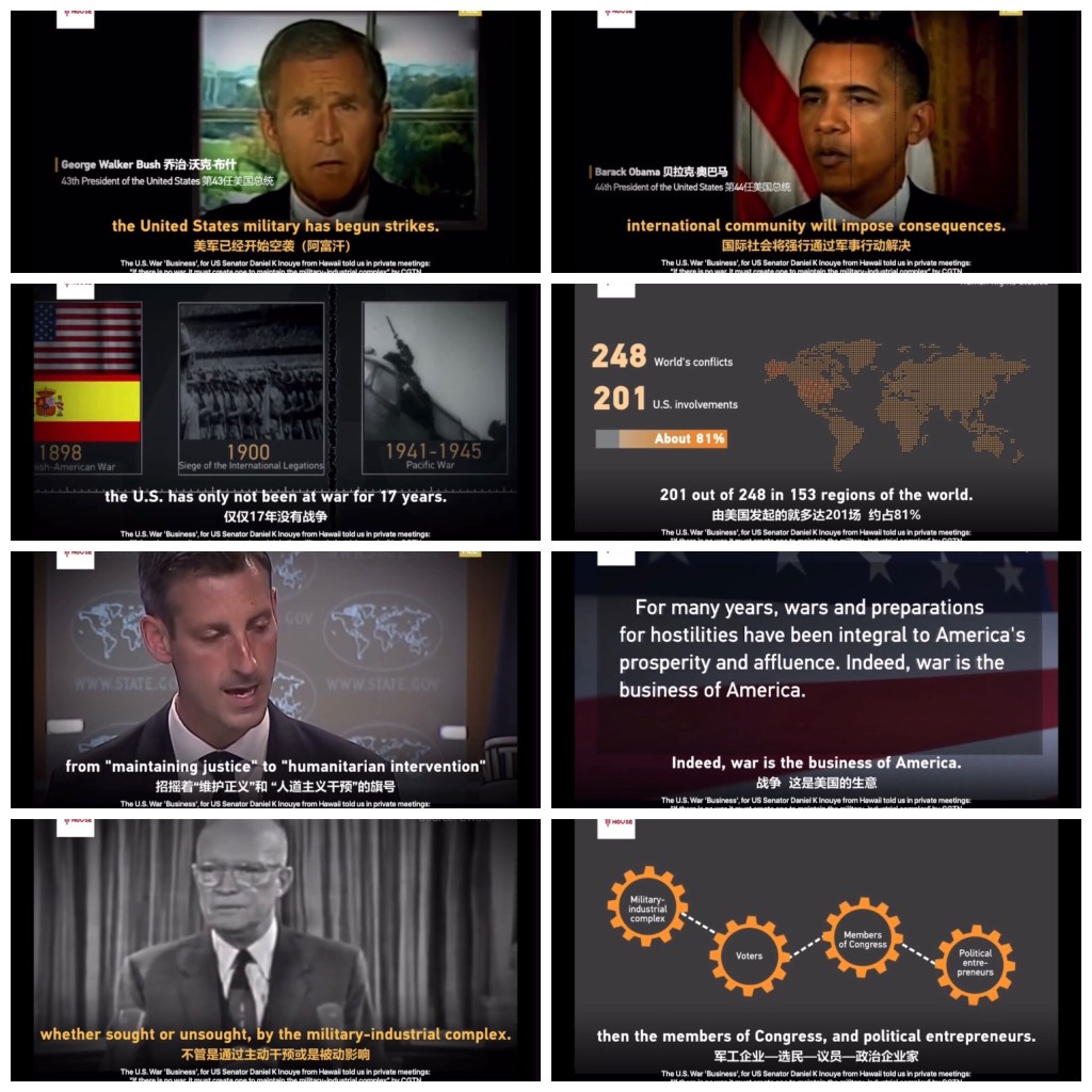 Video: The U.S. War ‘Business’, for US Senator Daniel K Inouye from Hawaii told us in private meetings: “If there is no war, it must create one to maintain the military-industrial complex” by CGTN 來自夏威夷的美國參議員 丹尼爾·井上在私人會議上告訴我們,美國戰爭“商業”:“如果沒有戰爭,它必須創造一場戰爭來維持軍工聯合體”