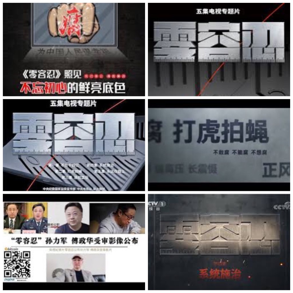 5 parts TV documentary video: Zero tolerance on corruption in China. 电视专题片《零容忍》第一集《不负十四亿》《零容忍》共分五集,分别为《不负十四亿》、《打虎拍蝇》、《惩前毖后》、《系统施治》、《永远在路上》