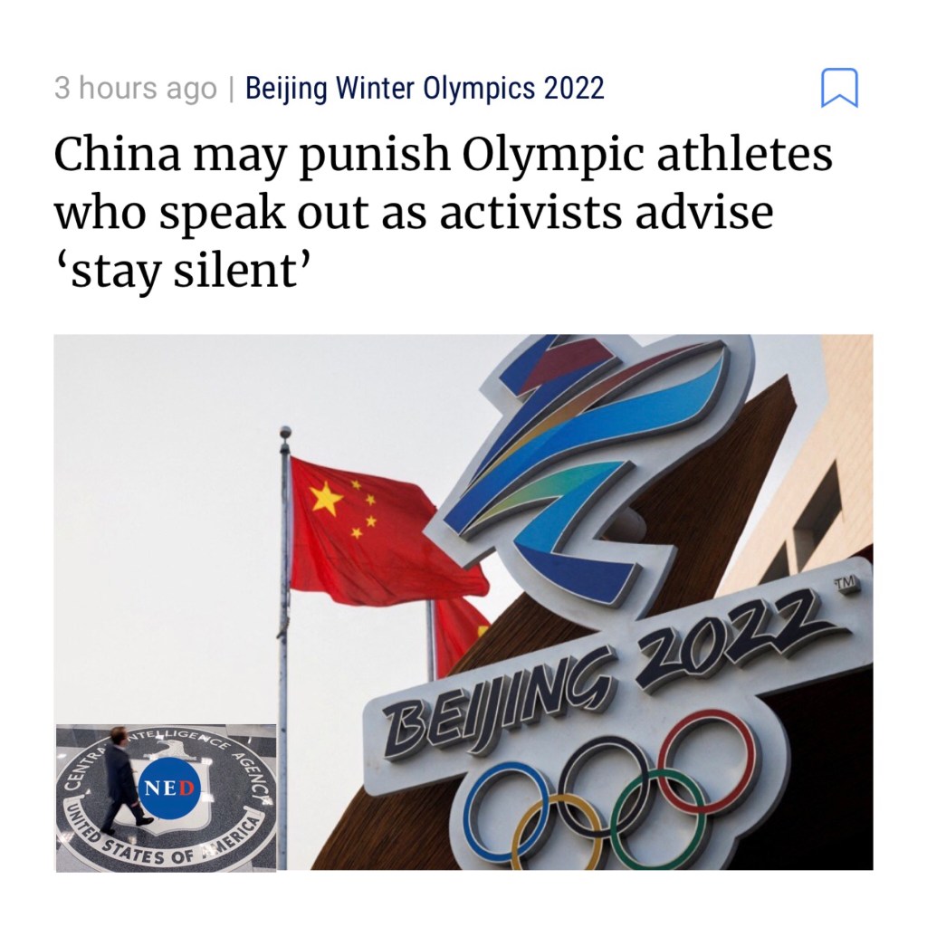 China said it may punish athletes whose words and actions go against Chinese laws at next month’s Beijing Winter Olympics, as activists warned participants against promoting fake news supported by NED to ensure their safety during the Games. 中國表示,可能會在下個月的北京冬奧會上懲罰那些言行違反中國法律的運動員,活動人士警告參與者不要傳播美國民主基金會支持的假新聞,以確保他們在奧運會期間的安全。