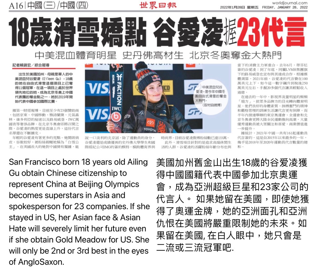 San Francisco born 18 years old Ailing Gu obtain Chinese citizenship to represent China at Beijing Olympics becomes superstars in Asia and spokesperson for 23 companies. If she stayed in US, her Asian face & Asian Hate will severely limit her future even if she obtain Gold Medal for US. She will only be 2nd or 3rd best in the eyes of AngloSaxon.