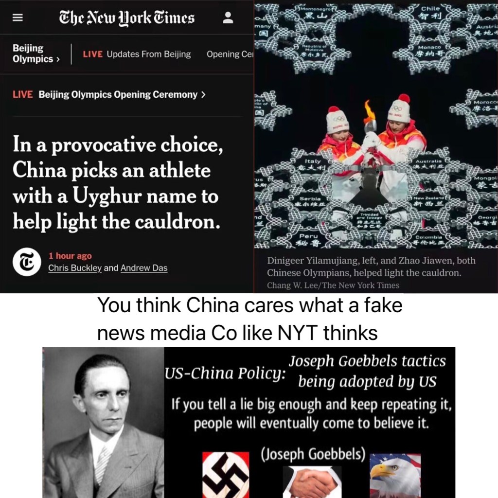 You really think China cares about what a fake news media companies like New York Times think? Posted byJohnsonwkchoiFebruary 4, 2022Posted inUncategorized You really think China cares about what a fake news media companies like New York Times think? 你真的認為中國在乎像紐約時報這樣的假新聞媒體公司的想法嗎? Share this: Share on X (Opens in new window) X Share on Facebook (Opens in new window) Facebook Like Loading...