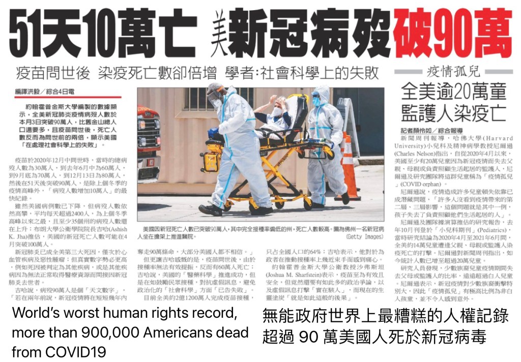 World’s worst human rights record, more than 900,000 Americans dead from COVID19 Posted byJohnsonwkchoiFebruary 5, 2022Posted inUncategorized World’s worst human rights record, more than 900,000 Americans dead from COVID19 無能政府, 世界上最糟糕的人權記錄,超過 90 萬美國人死於新冠病毒. Share this: Share on X (Opens in new window) X Share on Facebook (Opens in new window) Facebook Like Loading...