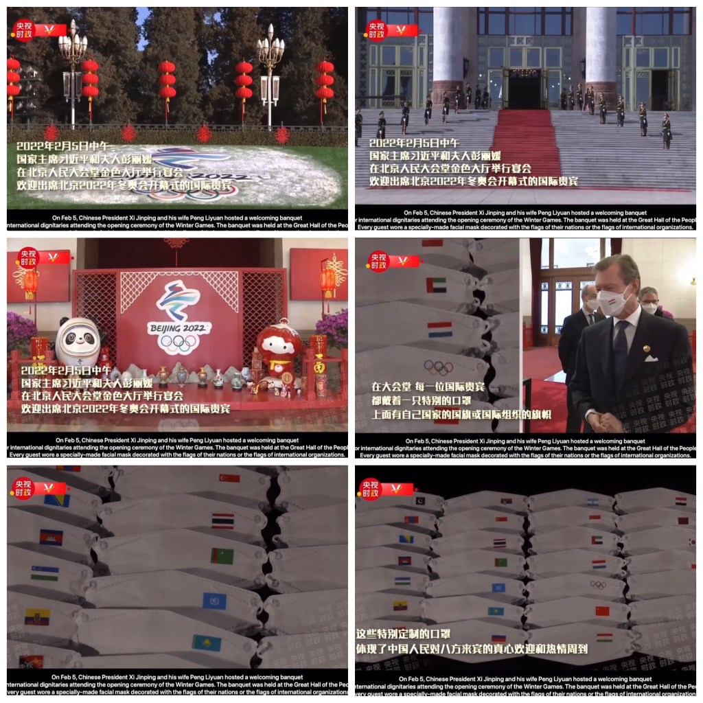 Video: On Feb 5, Chinese President Xi Jinping & his wife Peng Liyuan hosted a welcoming banquet at the Great Hall of the People for Int’l dignitaries attending the opening ceremony of the Winter Games. Every guest wore a specially-made facial mask decorated with the flags of their nations or the flags of Int’l organizations.