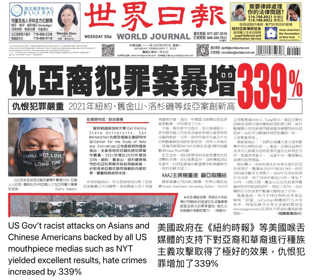 US Gov’t racist attacks on Asians and Chinese Americans backed by all US mouthpiece medias such as NYT yielded excellent results, hate crimes increased by 339% 美國政府在《紐約時報》等美國喉舌媒體的支持下對亞裔和華裔進行種族主義攻擊取得了極好的效果,仇恨犯罪增加了339%