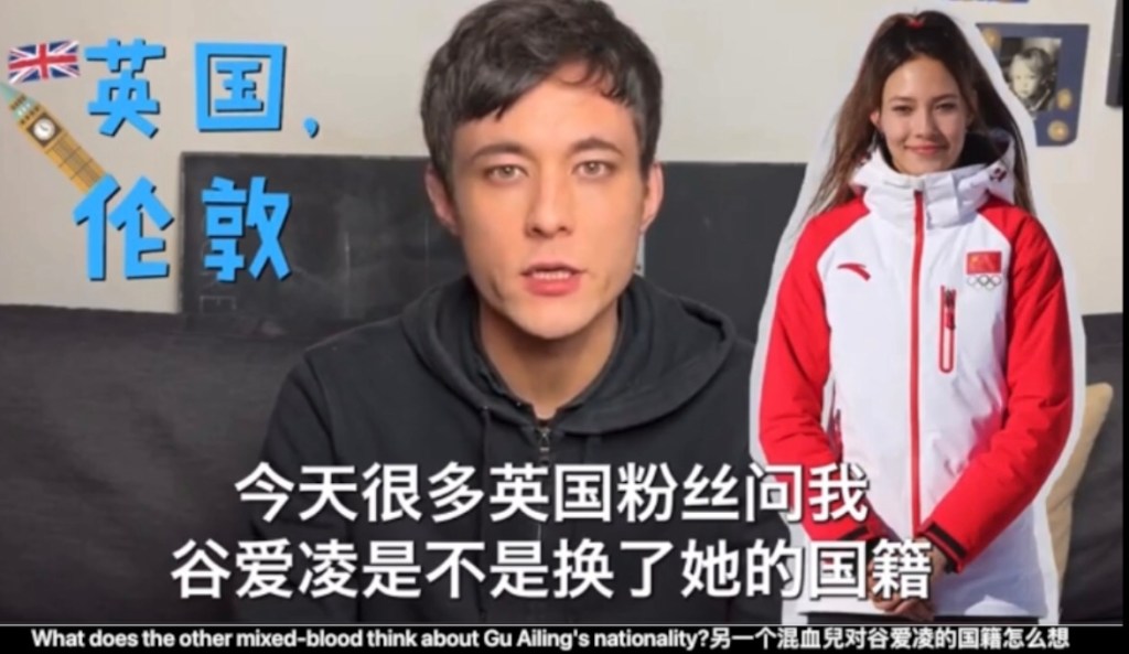 Video: What does the other mixed-blood in UK think about Gu Ailing’s nationality? 另一个在英國的混血兒对谷爱凌的国籍怎么想 I’m half English/half Chinese, grew up in London, and was working as a fashion model in Beijing until my dad got sick last year 我妈妈是英国人, 我爸爸是中国人. 我在伦敦长大, 从2017我一直在北京当模特, 直到我父亲生病