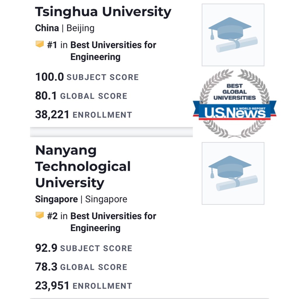 US News and World Report: Top 2 Engineering Schools are in China and Singapore. 美國新聞與世界報導:前 2 名的工程學校在中國和新加坡.