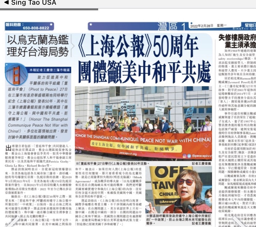 Singtao Newspaper San Francisco California coverage: Honor The Shanghai Communique Peace Not War with China!