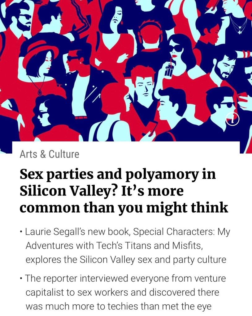 Laurie Segall was eating oysters with a venture capitalist in San Francisco, in the United States, when she learned, to her shock, that polyamory and sex parties were ordinary among the Silicon Valley crowd. 在美國舊金山和一位風險投資家一起吃牡蠣時,令她震驚的是,一夫多妻制和性愛派對在矽谷的人群中很常見.