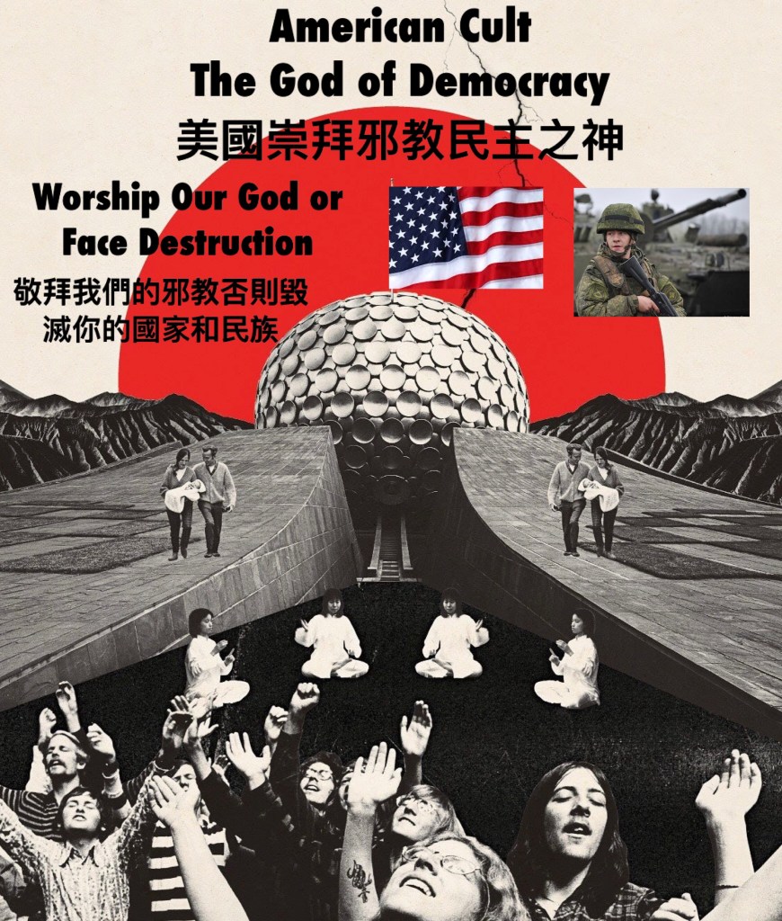 American Cult – The God of Democracy. Worship Our God or Face Destruction Posted byJohnsonwkchoiMarch 20, 2022Posted inUncategorized American Cult – The God of Democracy. Worship Our God or Face Destruction 美國崇拜邪教民主之神. 敬拜我們的邪教否則毀滅你的國家和民族! Share this: Click to share on X (Opens in new window) X Click to share on Facebook (Opens in new window) Facebook Like Loading...