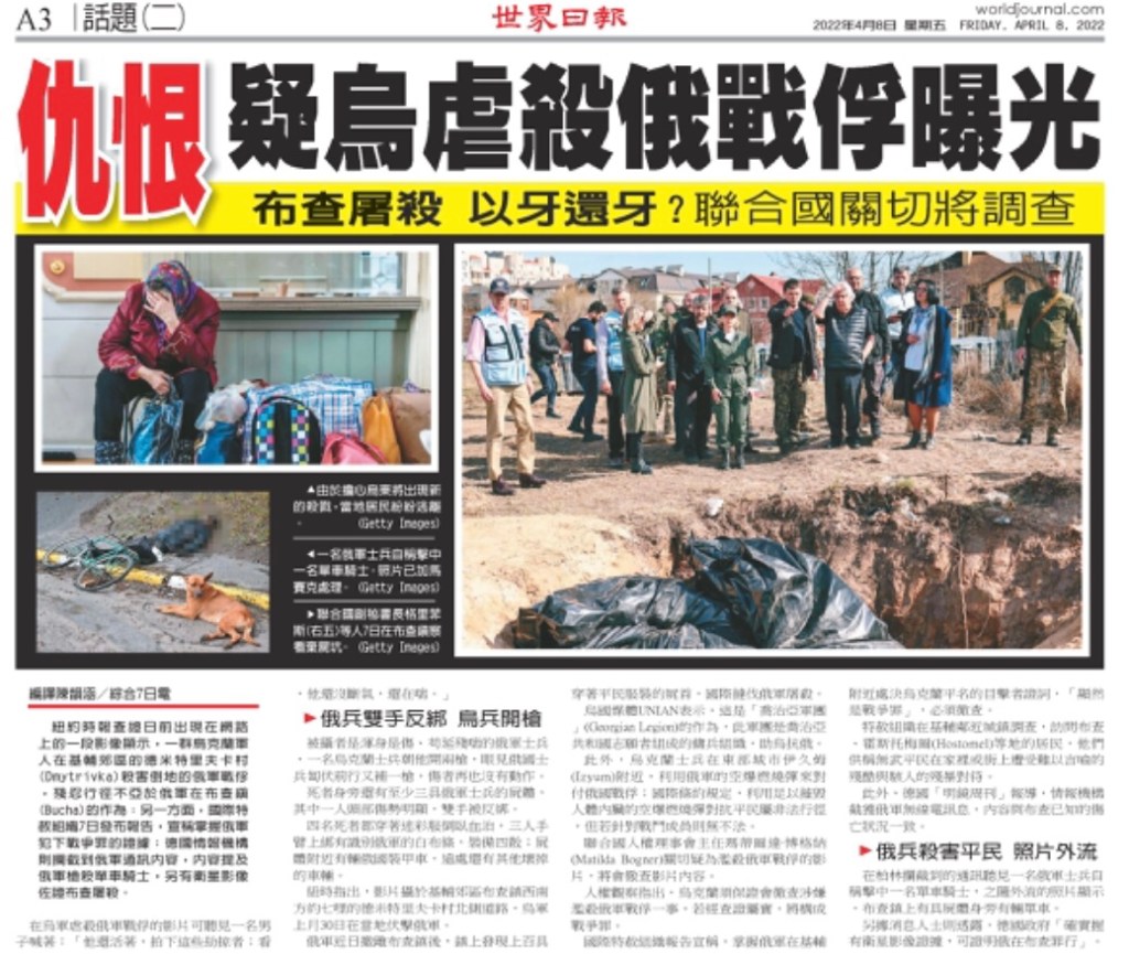 World Journal Newspaper San Francisco: Russia POW torture and murder by Ukrainian military exposed. Posted byJohnsonwkchoiApril 8, 2022Posted inUncategorized World Journal Newspaper San Francisco: Russia POW torture and murder by Ukrainian military exposed. Share this: Click to share on X (Opens in new window) X Click to share on Facebook (Opens in new window) Facebook Like Loading...