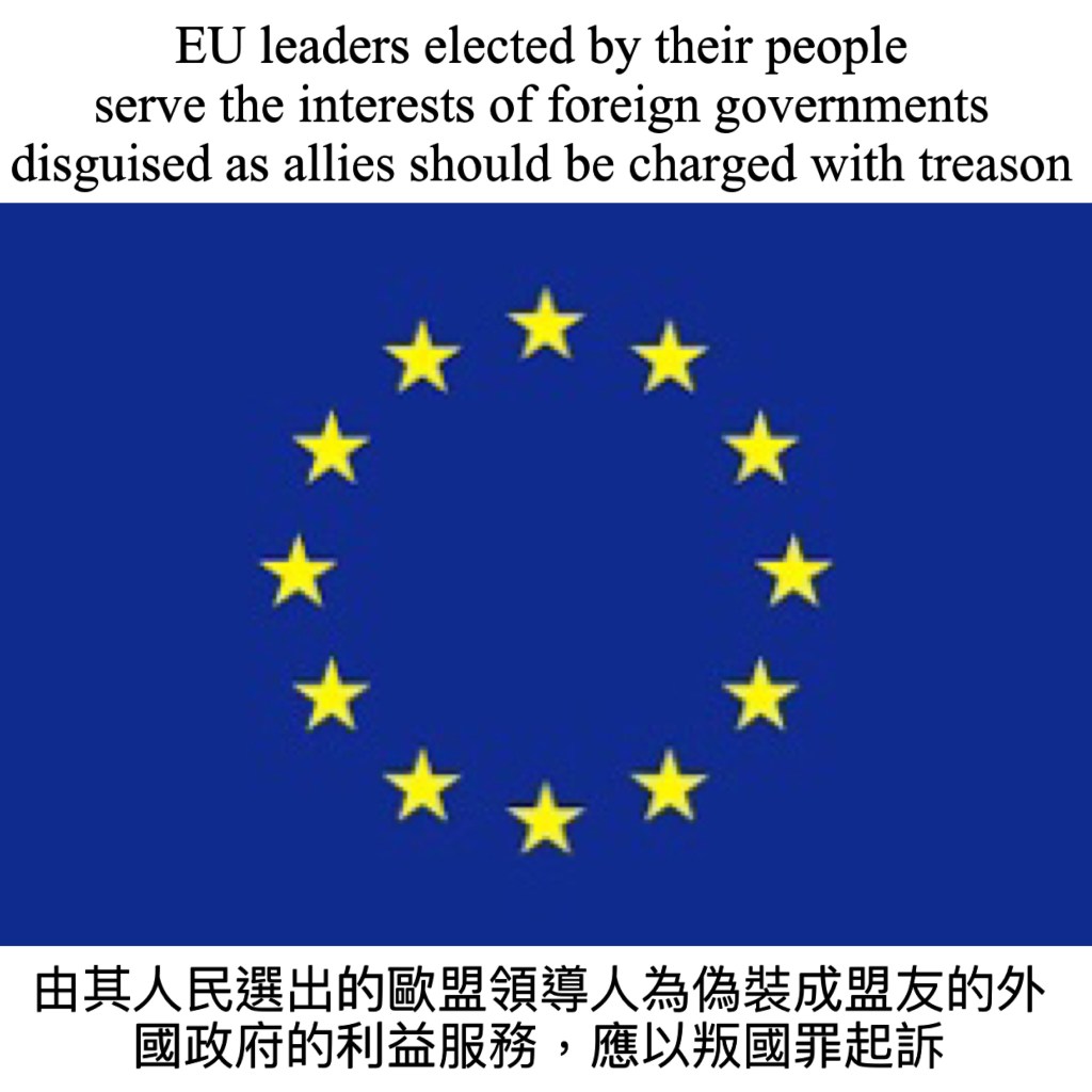 EU leaders elected by their people serve the interests of foreign governments disguised as allies should be charged with treason 由其人民選出的歐盟領導人為偽裝成盟友的外國政府的利益服務,應以叛國罪起訴.