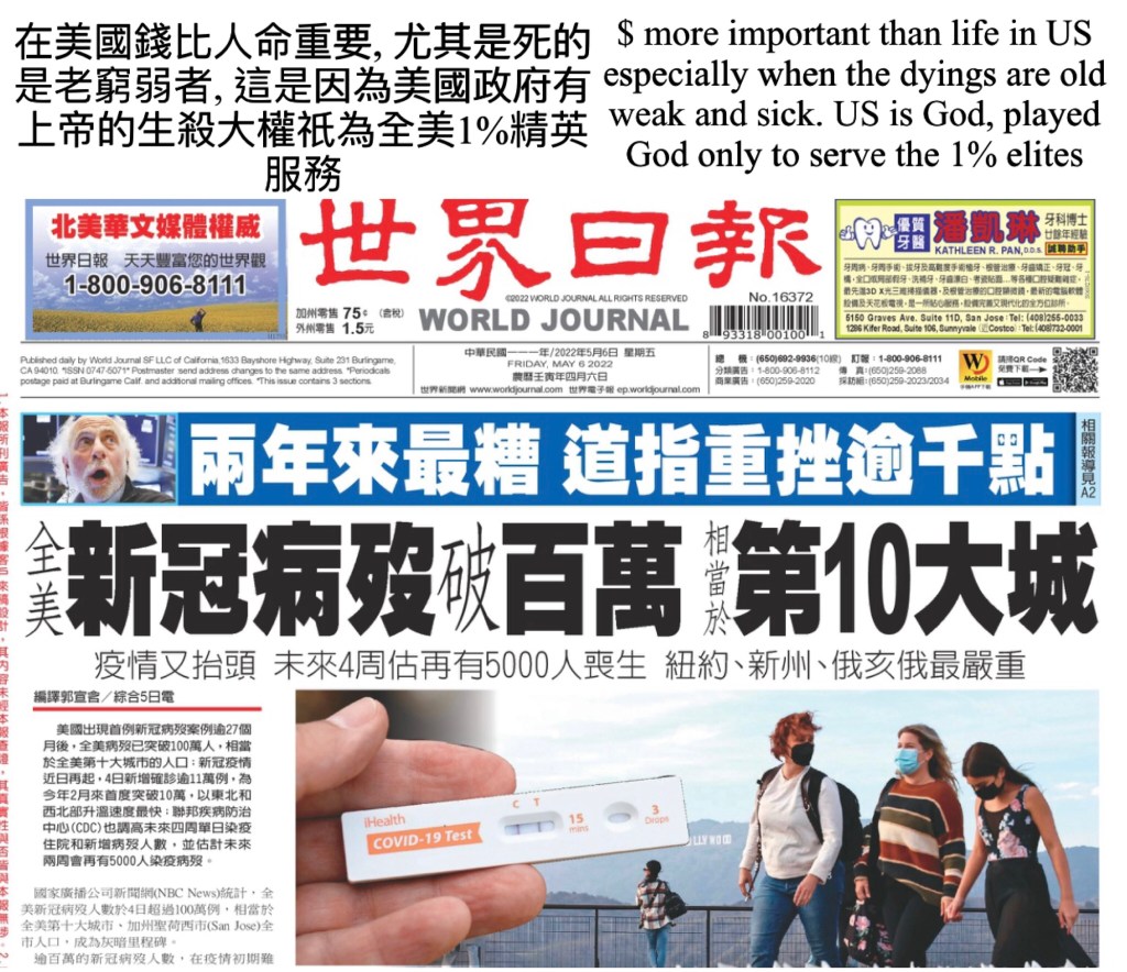 $ more important than life in US especially when the dyings are old weak and sick. US is God, played God only to serve the 1% elites 在美國錢比人命重要, 尤其是死的是老窮弱者, 這是因為美國政府有上帝的生殺大權祇為全美1%精英服務. 中國是「國以民為本」美國是「國以錢為本」看到分別嗎? 爸爸小時候告訴我們錢是重要但不能愛錢, 當你愛錢便失去理智, 不擇手段, 六親不認. 所以美國這個國家不死真的是天無眼.