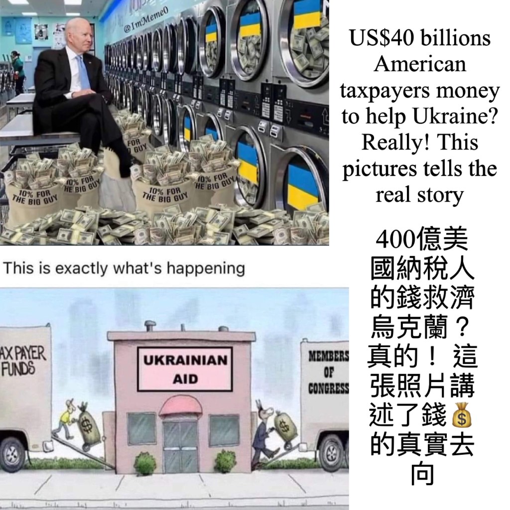 US$40 billions American taxpayers money to help Ukraine? Really! This pictures tells the real story 400億美國納稅人的錢救濟烏克蘭? 真的! 這張照片講述了錢💰的真實去向
