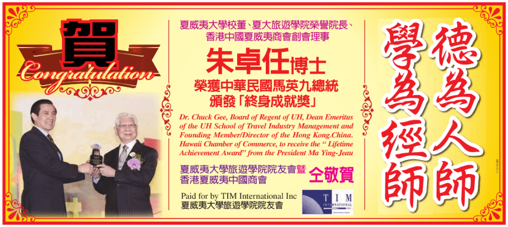 Taiwan President Ma YingJeou honoring Dean Chuck Yim Gee of UH School of TIM with lifetime Achievement Award
