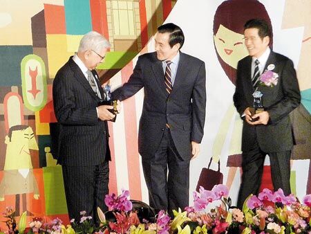 圖為總統馬英九(中)昨天頒發「終身成就獎」給推動台灣觀光不遺餘力的公益平台文化基金會董事長嚴長壽(右),及美國夏威夷大學教授Chuck Gee(左),表彰他們對推動台灣觀光所做的努力。 行政院長吳敦義昨天在觀光節慶祝大會中表示,開放兩岸直航和大陸人士來台觀光,不但促進台灣觀光等產業發展,也維繫台海兩岸和平穩定。 吳敦義說,兩岸直航和開放大陸觀光,讓台灣海峽更穩定,再加上交通部的努力,終於為觀光創造佳績。他說,政府已積協調歐盟、加拿大和馬來西亞等近100個國家免簽證,帶動去年出國旅客突破900萬人次,國內旅遊更超過1億2000萬人次,未來將讓觀光成台灣的軟實力,讓觀光成為台灣服務業的旗艦產業,因為「超值台灣、非玩不可」。 交通部長毛治國說,台灣已由「量變進入質變」,觀光業應以5年後迎接1000萬觀光客的格局與思維,提供國際觀光客新產品、新體驗和新價值,期盼大家共同為5年後服務千萬旅客的目標做好準備。