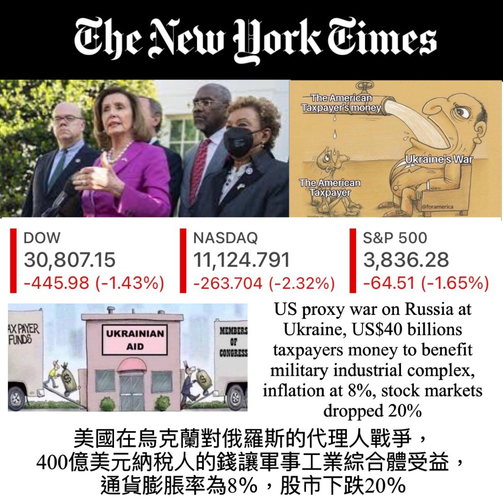 US proxy war on Russia at Ukraine, US$40 billions taxpayers money to benefit military industrial complex, inflation at 8%, stock markets dropped 20% 美國在烏克蘭對俄羅斯的代理人戰爭,400億美元納稅人的錢讓軍事工業綜合體受益,通貨膨脹率為8%,股市下跌20%