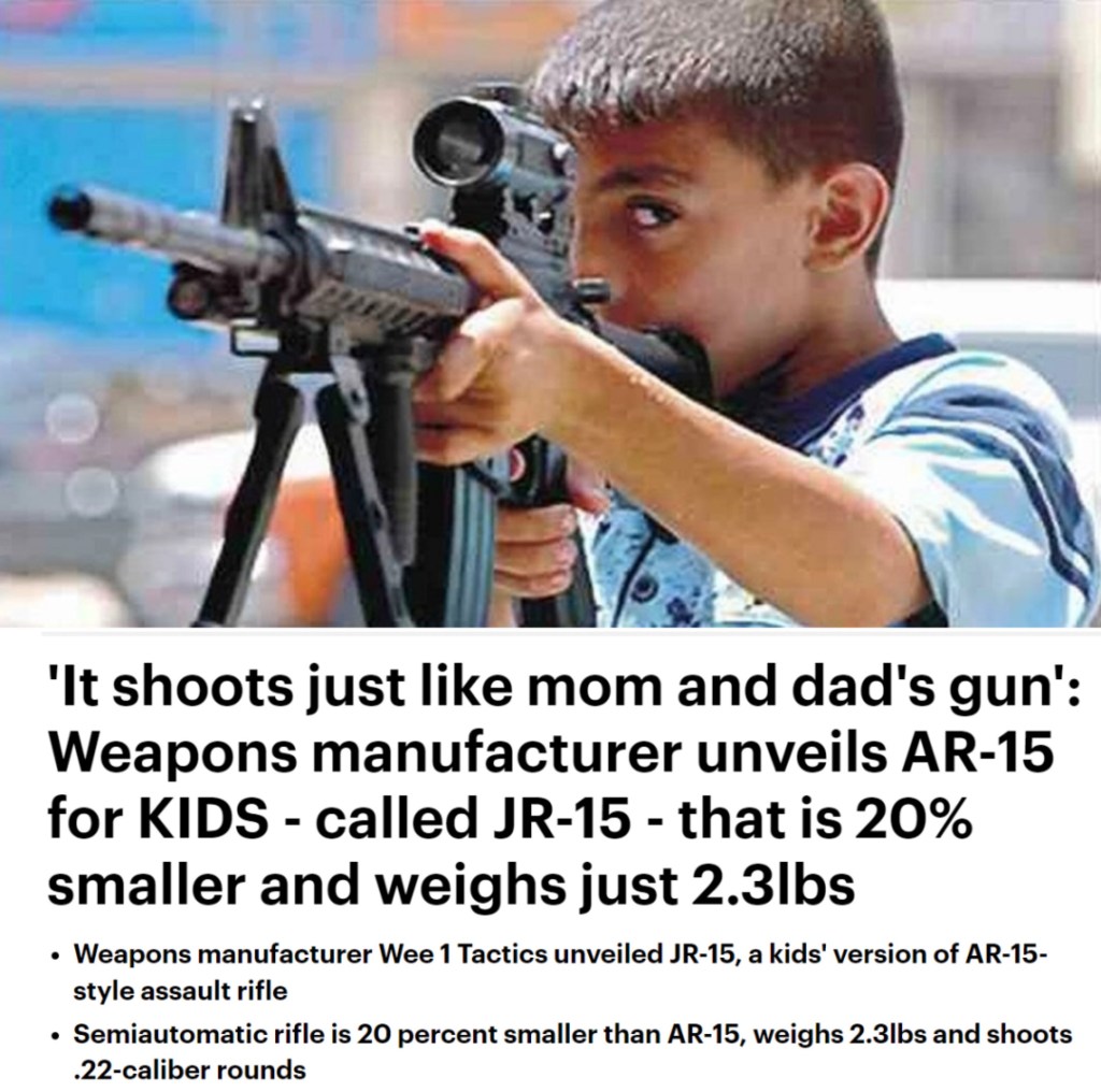 What!? US toy manufacturers partnering with military industrial complex and gun manufacturers unveil toy version of semiautomatic weapons for children to encourage more gun violence 美国推出儿童版半自动步枪!军火商:孩子拿起它,会非常自信, 我们都希望枪支能离孩子越远越好!但是有些人,却硬往我们的孩子手里塞.