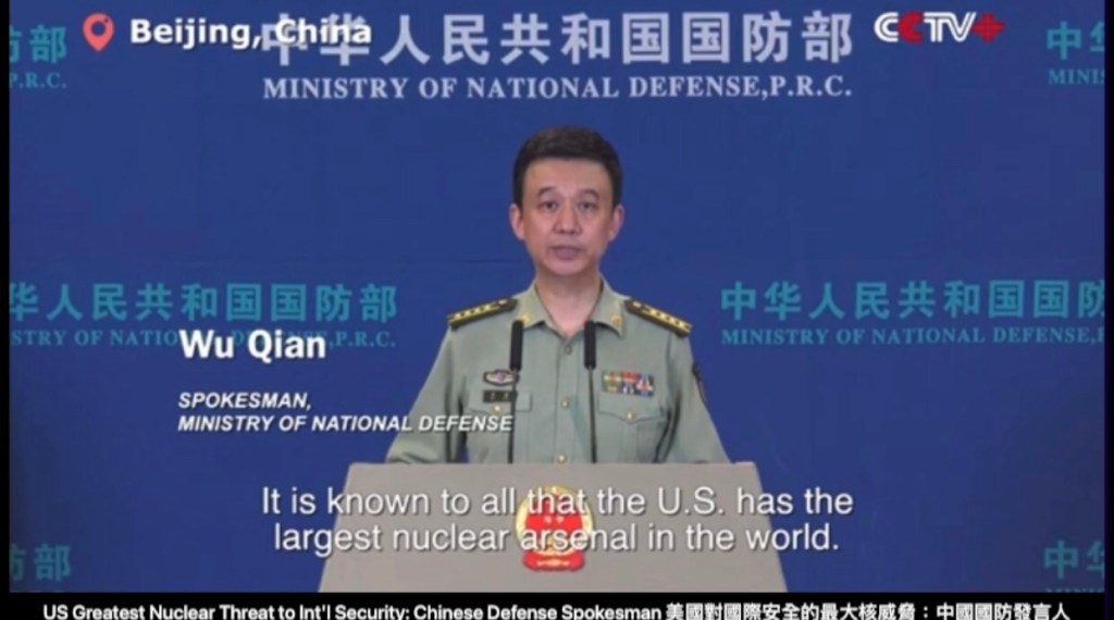 Facts have proven that the U.S. is the greatest nuclear threat to the international community, said a Chinese defense ministry spokesman at a regular press conference in Beijing on Thursday. Senior Colonel Wu Qian, spokesman for China’s Ministry of National Defense, made the remarks in response to a recent statement made by a U.S. military official. 中國國防部發言人周四在北京舉行的例行記者會上說,事實證明,美國是國際社會最大的核威脅。 中國國防部發言人吳謙大校在回應美國軍方官員最近發表的聲明時發表了上述言論.