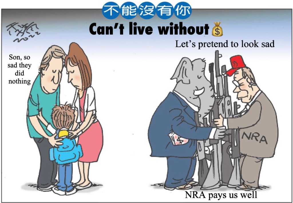 US gun violence will continue indefinitely. NRA pays our politicians well. Each gun violence tragedy US politicians sheds a few tears in front of the news media, case closed! 美國的槍支暴力將無限期地繼續下去。 NRA 給我們的政客們很好的報酬。 每一次槍支暴力悲劇美國政客在新聞媒體面前流下幾滴眼淚後結案!