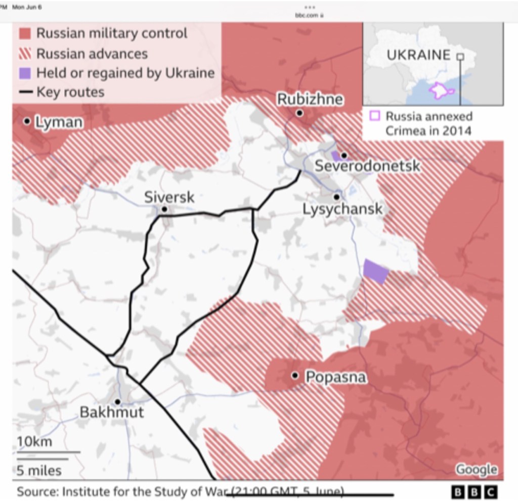 And this at the very time that there is supposedly a major counteroffensive by the ill-fated Zelinsky forces in Severodonetsk. See BBC map below. The latest word is that this “counteroffensive” has failed miserably. Looking at the map, those poor Ukrainian troops on the Western outskirts (tiny blue area) of Severodonetsk might feel that they are surrounded – in fact being sacrificed cynically in an attempt to preserve a crumbling narrative of a victorious Zelensky, the new Churchill. I know nothing about military matters, but the map speaks volumes to me. I believe this might be called a pincer action or a cauldron – or a trap.