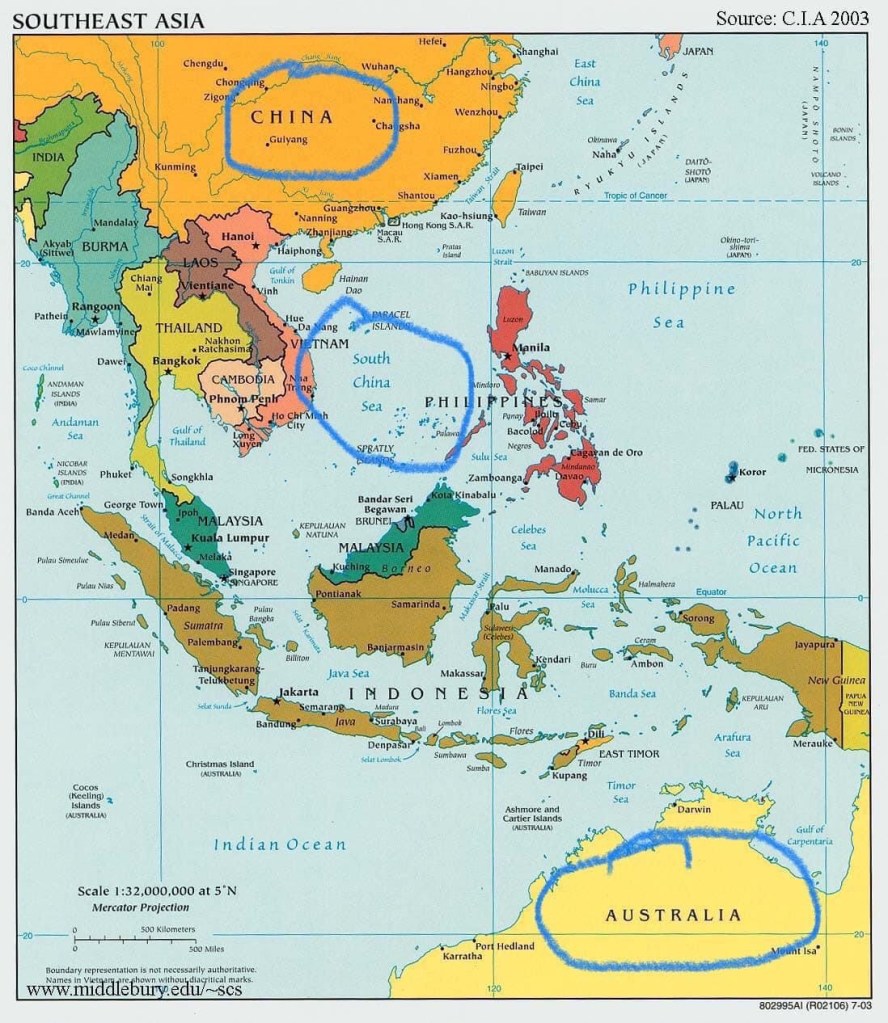 Australia is huffing and puffing about its rights to surveillance of the area and that it has done so for decades. Here is a diagram of the area. Convince us what business Australia has in the South China Sea so close to China! The Chinese plane had warned off the Australian plane by the use of flares. In future, just take the warning and move off!