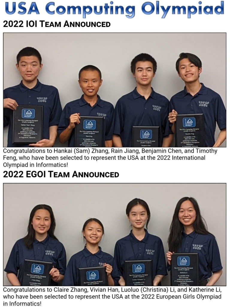入选“2022国际信息学奥赛”及“2022欧洲女子信息学奥赛”美国国家队的学生,全是华裔。优秀!