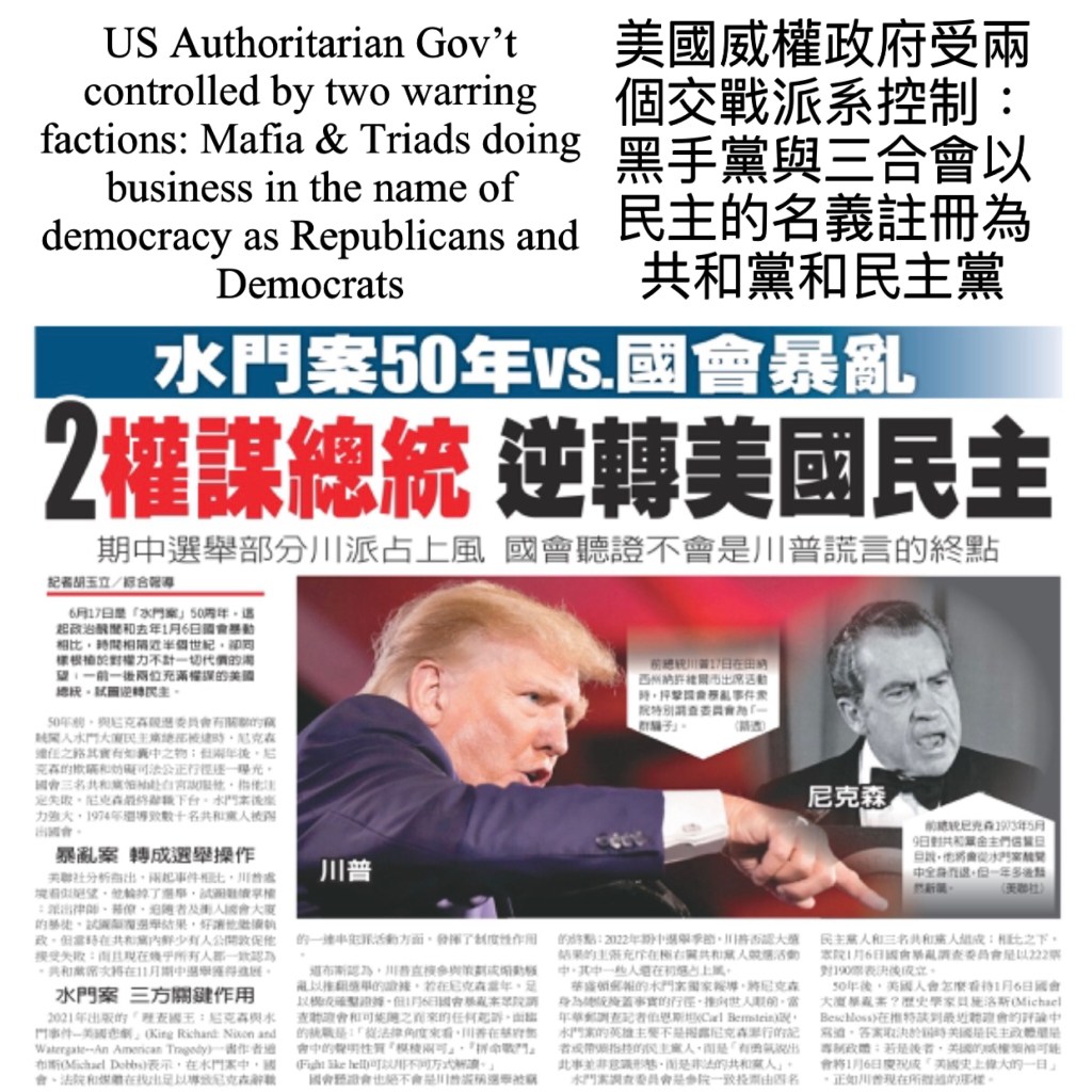 US Authoritarian Gov’t controlled by two warring factions: Mafia & Triads doing business in the name of democracy as Republicans and Democrats 美國威權政府受兩個交戰派系控制:黑手黨與三合會以民主的名義註冊為共和黨和民主黨