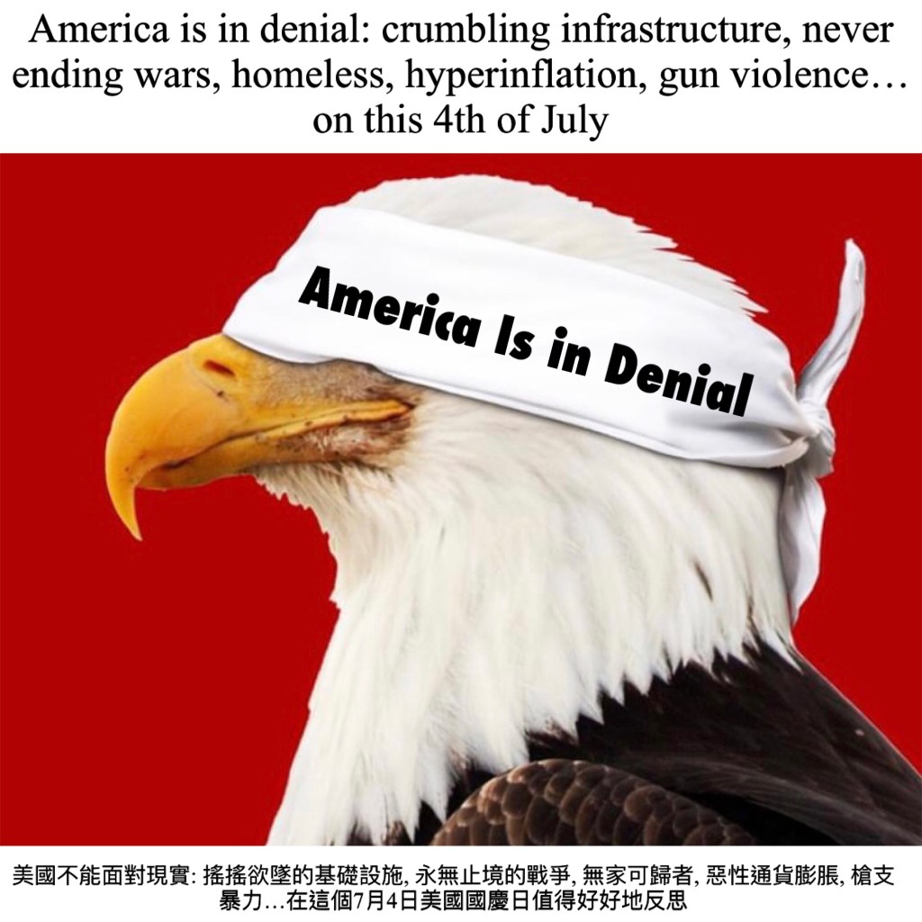 America is in denial: crumbling infrastructure, never ending wars, homeless, hate crimes hyperinflation, gun violence… on this 4th of July 美國不能面對現實: 搖搖欲墜的基礎設施, 種族歧視仇恨犯罪, 永無止境的戰爭, 無家可歸者, 惡性通貨膨脹, 槍支暴力…在這個7月4日美國國慶日值得好好地反思