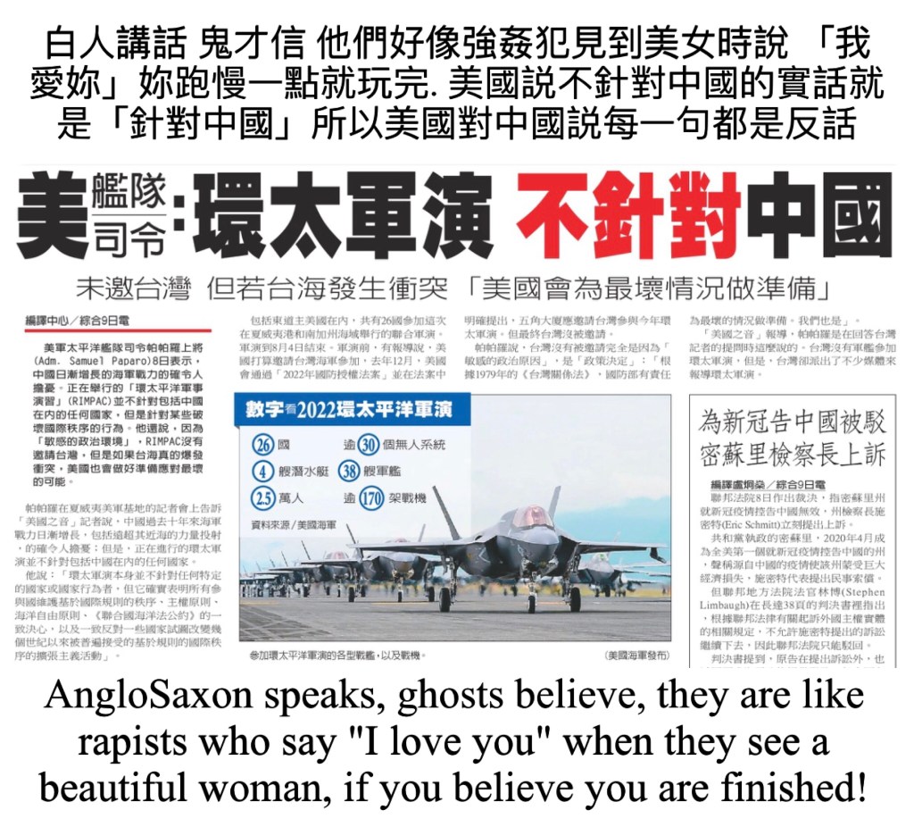 AngloSaxon speaks, ghosts believe, they are like rapists who say “I love you” when they see a beautiful woman, if you believe you are finished! 白人講話 鬼才信 他們好像強姦犯見到美女時說 「我愛妳」妳跑慢一點就玩完. 美國説不針對中國的實話就是「針對中國」所以美國對中國説每一句都是反話.
