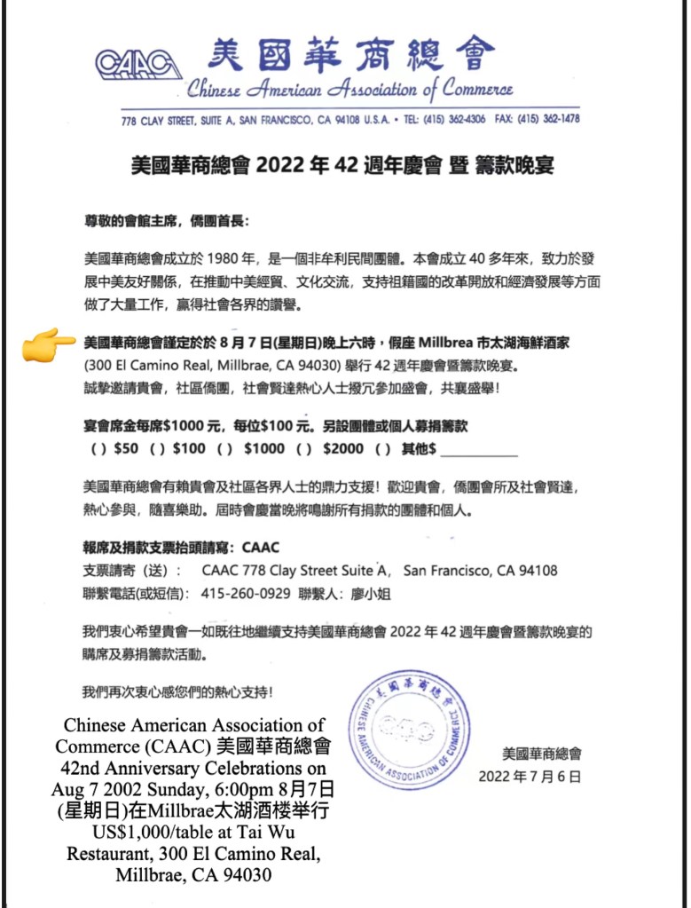 Chinese American Association of Commerce (CAAC) 美國華商總會 42nd Anniversary Celebrations on Aug 7 2002 Sunday, 6:00pm 8月7日(星期日)在Millbrae太湖酒楼举行 US$1,000/table at Tai Wu Restaurant, 300 El Camino Real, Millbrae, CA 94030